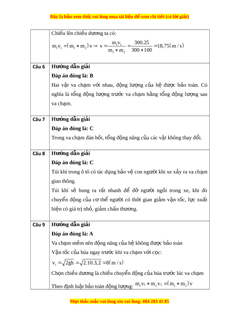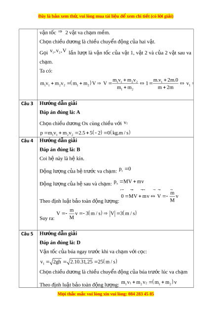 Đây là bản xem th , vu ử i lòng mua tài li u ệ đ xe ể m chi ti t (c ế ó l i ờ gi i ả ) v n ậ tốc 2 v t ậ va ch m ạ m m ề . Ch n ọ chi u d ề ư ng ơ là chi u chuy ề n đ ể ng ộ c a hai ủ v t ậ . G i ọ v , v ,V 1 2 lần lư t ợ là v n ậ t c ố c a ủ v t ậ 1, v t ậ 2 và c a ủ 2 v t ậ sau va ch m ạ . Ta có: m v m v m.v 2m.0 m v m v m m 1 1 2 2 1 V V 1 v 3 m / s 1 1 2 2 1 2 1 m m m 2m 1 2 Câu 3 Hư ng d ớ ẫn gi i ả Đáp án đúng là: A Ch n ọ chi u d ề ư ng ơ Ox cùng chi u v ề i ớ 1 v p m v m v 2. 5 5 2 0 kg.m / s 1 1 2 2 Câu 4 Hư ng d ớ ẫn gi i ả Đáp án đúng là: B Coi hệ này là h k ệ ín.