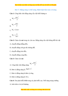 Bài 17. Đ ng năng và t ộ h n ế ăng. Đ nh l ị u t ậ b o t ả oàn c năng ơ Câu 1: Công th c t ứ ính đ ng năng c ộ a ủ v t ậ kh i ố lư ng m ợ 2 m. W A. d 2 m. W B. d 2 C. W 2 .m. d 2 Wd D. m. Câu 2: Ch n