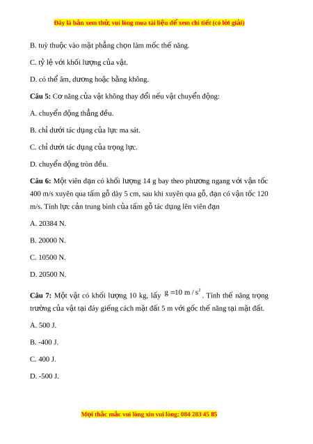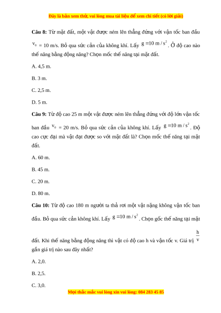 Đây là bản xem th , vu ử i lòng mua tài li u ệ đ xe ể m chi ti t ế (có l i ờ gi i ả ) Câu 8: Từ m t ặ đ t ấ , m t ộ v t ậ đư c ợ ném lên th ng ẳ đ ng ứ v i ớ v n ậ t c ố ban đ u ầ v 2 g 1 0 m / s 0 = 10 m/s. Bỏ qua s c ứ c n ả c a ủ không khí. L y ấ . Ở độ cao nào th năng b ế ng ằ đ ng năng? C ộ h n ọ m c ố thế năng t i ạ m t ặ đ t ấ . A. 4,5 m. B. 3 m. C. 2,5 m. D. 5 m.