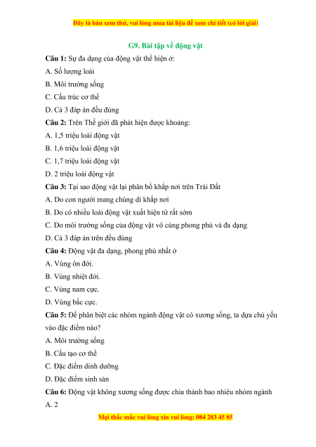 Câu 1: Sự đa dạng của động vật thể hiện ở: A. Số lượng loài B. Môi trường sống C. Cấu trúc cơ thể