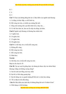 Câu 8: Ngành ruột khoang có khoảng bao nhiêu loài A. 5 nghìn loài. B. 10 nghìn loài. C. 15 nghìn loài. D. 20 nghìn loài.