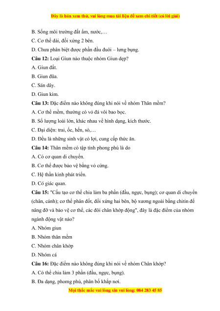 Câu 11: Đặc điểm nào dưới đây là không đúng khi nói về nhóm Giun?