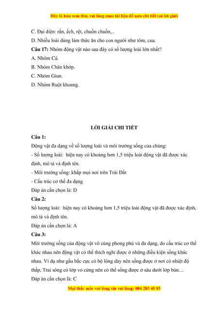 Câu 17: Nhóm động vật nào sau đây có số lượng loài lớn nhất? A. Nhóm Cá. B. Nhóm Chân khớp. C. Nhóm Giun. D. Nhóm Ruột khoang.