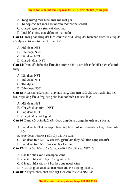 Câu 14: Dạng đột biến nào làm tăng cường hoặc giảm bớt mức biểu hiện của tính trạng A. Lặp đoạn NST B. Mất đoạn NST C. Thể dị bội D. Đảo đoạn NST