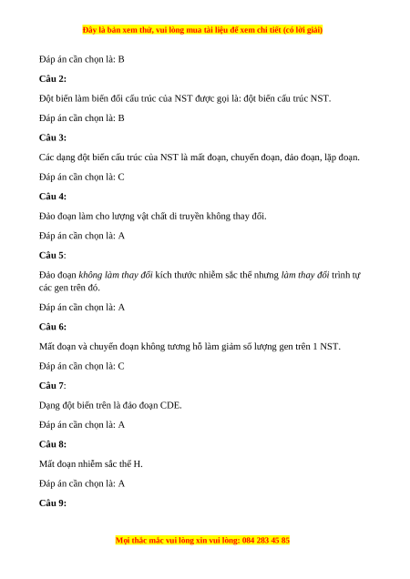 Câu 4: Trong các dạng đột biến cấu trúc NST, dạng làm cho lượng vật chất di