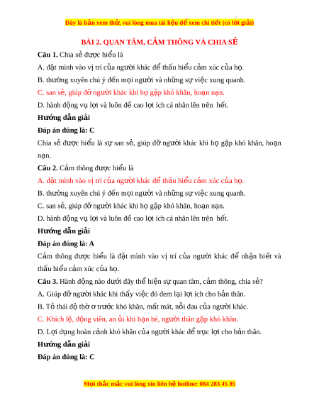 Đây là bản xem th , vu ử i lòng mua tài li u ệ đ xe ể m chi ti t (c ế ó l i ờ gi i ả ) BÀI 2. QUAN TÂM, C M Ả THÔNG VÀ CHIA SẺ Câu 1. Chia s đ ẻ ư c ợ hi u l ể à A. đ t ặ mình vào v t ị rí c a ng ủ ư i ờ khác đ t ể h u hi ấ u c ể m ả xúc c a h ủ . ọ B. thư ng xuyên chú ý đ ờ n ế m i ọ ngư i ờ và nh ng s ữ ự vi c xung quanh. ệ C. san sẻ, giúp đ ng ỡ ư i ờ khác khi h g ọ p khó khăn, ho ặ n ạ n n. ạ D. hành đ ng v ộ l ụ i ợ và luôn đ cao ề l i