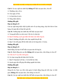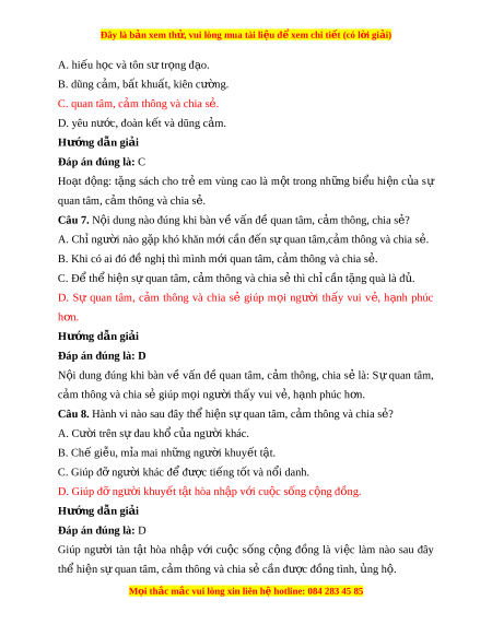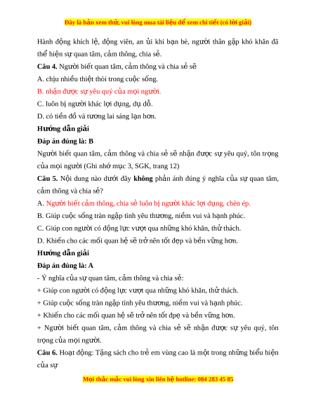 Đây là bản xem th , vu ử i lòng mua tài li u ệ đ xe ể m chi ti t (c ế ó l i ờ gi i ả ) Hành đ ng ộ khích l , ệ đ ng ộ viên, an i ủ khi b n ạ bè, ngư i ờ thân g p ặ khó khăn đã th hi ể n s ệ ự quan tâm, c m ả thông, chia s . ẻ Câu 4. Ngư i ờ bi t ế quan tâm, c m ả thông và chia s s ẻ ẽ A. chịu nhi u t ề hi t ệ thòi trong cu c ộ s ng. ố B. nh n đ ậ ư c ợ s yêu ự quý c a m ủ i ọ ngư i ờ . C. luôn b ng ị ư i ờ khác l i ợ d ng, d ụ d ụ . ỗ D. có ti n ề đ và t ồ ư ng ơ lai sáng l n ạ h n. ơ Hư ng d ớ ẫn gi i ả Đáp án đúng là: B Ngư i ờ bi t ế quan tâm, c m ả thông và chia s ẻ s ẽ nh n ậ đư c ợ s ự yêu quý, tôn tr ng ọ c a ủ m i ọ ngư i ờ (Ghi nh m ớ c 3, SG ụ K, trang 12) Câu 5. N i ộ dung nào dư i ớ đây không ph n ả ánh đúng ý nghĩa c a ủ sự quan tâm, c m ả thông và chia sẻ? A. Ngư i ờ bi t ế c m
