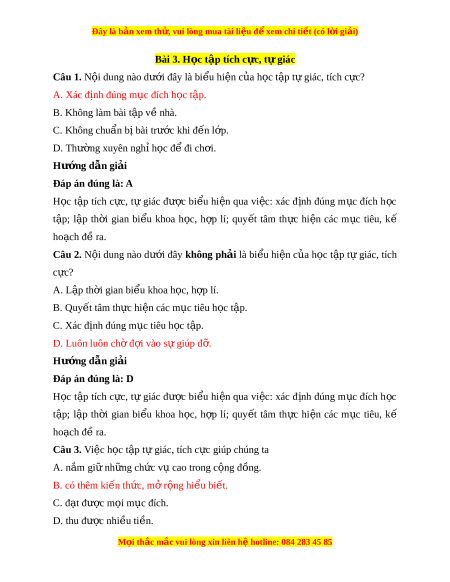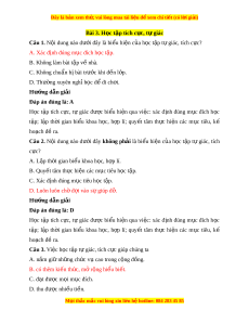 Đây là bản xem th , vu ử i lòng mua tài li u ệ đ xe ể m chi ti t (c ế ó l i ờ gi i ả ) Bài 3. H c t ọ p t ậ ích c c, t ự gi ự ác Câu 1. N i ộ dung nào dư i ớ đây là bi u ể hi n c ệ a ủ h c t ọ p ậ t gi ự ác, tích c c? ự A. Xác đ nh đúng m ị c ụ đích h c t ọ p. ậ B. Không làm bài t p v ậ nhà. ề