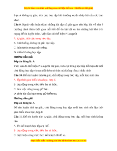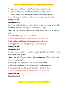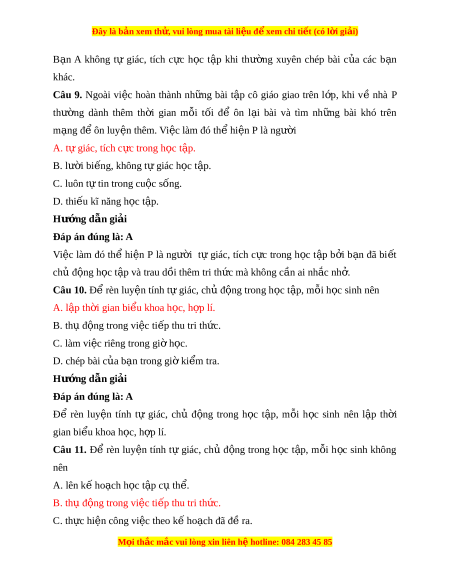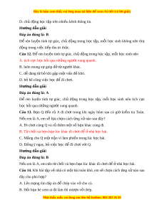 ạ A không tự giác, tích c c ự h c ọ t p ậ khi thư ng ờ xuyên chép bài c a ủ các b n ạ khác. Câu 9. Ngoài vi c ệ hoàn thành nh ng ữ bài t p ậ cô giáo giao trên l p, ớ khi về nhà P thư ng ờ dành thêm th i ờ gian m i ỗ t i ố để ôn l i ạ bài và tìm nh ng ữ bài khó trên m ng ạ đ ôn l ể uy n t ệ hêm. Vi c l ệ àm đó th hi ể n ệ P là ngư i ờ A. t gi ự ác, tích c c t ự rong h c t ọ p. ậ B. lư i ờ bi ng, không t ế gi ự ác h c ọ t p. ậ C. luôn t t ự in trong cu c ộ s ng. ố D. thi u kĩ ế năng h c ọ t p. ậ Hư ng d ớ ẫn gi i ả Đáp án đúng là: A Việc làm đó thể hi n ệ P là ngư i ờ tự giác, tích c c ự trong h c ọ t p ậ b i ở b n ạ đã bi t ế chủ đ ng h ộ c t ọ p ậ và trau d i ồ thêm tri th c ứ mà không c n ai ầ nh c ắ nh . ở