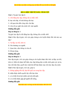 Đây là bản xem th , vu ử i lòng mua tài li u ệ đ xe ể m chi ti t (c ế ó l i ờ gi i ả ) BÀI 3. H C Ọ TẬP T G Ự IÁC, TÍCH C C Ự Câu 1. T gi ự ác h c ọ t p l ậ à A. chủ đ ng h ộ c t ọ p, ậ không c n ai ầ nh c nh ắ . ở B. h c t ọ rên l p, v ớ nhà không c ề n h ầ c. ọ C. ch quan t ỉ âm đ n công vi ế c c ệ a ủ l p. ớ D. chia s s ẻ uy nghĩ c a ủ mình v i ớ m i ọ ngư i ờ . Hư ng d ớ ẫn gi i ả Đáp án đúng là: A T gi ự ác h c ọ t p l ậ à ch đ ủ ng ộ h c t ọ p, ậ không c n ai ầ nh c nh ắ . ở Câu 2. H c ọ t p ậ tự giác, tích c c ự giúp chúng ta rèn luy n ệ đư c ợ đ c ứ tính nào sau đây? A. T l ự p, t ậ ch ự , ki ủ ên trì. B. Yêu thư ng con ng ơ ư i ờ . C. Quan tâm, c m ả thông và chia s . ẻ D. Khoan dung. Hư ng d ớ ẫn gi i ả Đáp án đúng là: A H c ọ t p ậ tự giác, tích c c ự giúp chúng ta rèn luy n ệ đư c ợ đ c ứ tính: t ự l p, ậ t ự ch , ủ kiên trì. Đi u ề đó đư c ợ thể hi n, ệ h c ọ t p ậ không đ i ợ ai nh c ắ nh , ở giám sát, t ự tin, làm chủ b n t ả hân, quy t ế tâm vư t ợ khó đ đ ể t ạ đư c ợ m c t ụ iêu h c t ọ p ậ c a m ủ ình. Câu 3. H c ọ t p t ậ gi ự ác, tích c c, gi ự úp ta A. không ng ng ừ ti n ế b , đ ộ t ạ k t ế qu cao t ả rong h c t ọ p. ậ B. nh n đ ậ ư c ợ nhi u quy ề n l ề i ợ , ti n b ề c ạ h n. ơ C. có c h ơ i ộ đi du l ch nhi ị u n ề i ơ trên th gi ế i ớ . D. có c h ơ i ộ đư c ợ g p g ặ ng ỡ ư i ờ n i ổ ti ng. ế Hư ng d ớ ẫn gi i ả M i