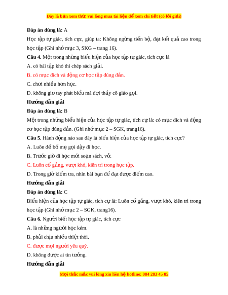 Đây là bản xem th , vu ử i lòng mua tài li u ệ đ xe ể m chi ti t (c ế ó l i ờ gi i ả ) Đáp án đúng là: A H c ọ t p ậ tự giác, tích c c, ự giúp ta: Không ng ng ừ ti n ế b , ộ đ t ạ k t ế quả cao trong h c ọ t p ( ậ Ghi nh m ớ c 3, SK ụ G – trang 16). Câu 4. M t ộ trong nh ng ữ bi u hi ể n c ệ a ủ h c t ọ p ậ t gi ự ác, tích c c ự là A. có bài t p khó t ậ hì chép sách gi i ả . B. có m c đí ụ ch và đ ng ộ c h ơ c t ọ p ậ đúng đ n. ắ C. ch i ơ nhi u h ề n h ơ c. ọ