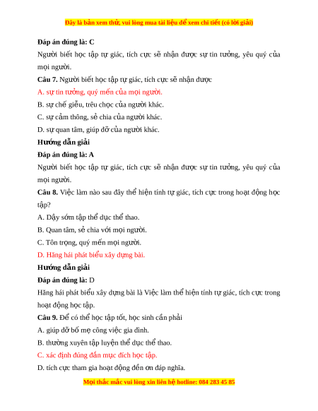 Đây là bản xem th , vu ử i lòng mua tài li u ệ đ xe ể m chi ti t (c ế ó l i ờ gi i ả ) Đáp án đúng là: C Ngư i ờ bi t ế h c ọ t p ậ tự giác, tích c c ự sẽ nh n ậ đư c ợ sự tin tư ng, ở yêu quý c a ủ m i ọ ngư i ờ . Câu 7. Ngư i ờ bi t ế h c t ọ p ậ t gi ự ác, tích c c s ự ẽ nh n đ ậ ư c ợ A. s t ự in tư ng, quý m ở n c ế a ủ m i ọ ngư i ờ . B. s ch ự ế gi u, t ễ rêu chọc c a ủ ngư i ờ khác. C. s c ự m ả thông, s chi ẻ a c a ủ ngư i ờ khác. D. s quan t ự âm, giúp đ c ỡ a ủ ngư i ờ khác. Hư ng d ớ ẫn gi i ả Đáp án đúng là: A Ngư i ờ bi t ế h c ọ t p ậ tự giác, tích c c ự sẽ nh n ậ đư c ợ sự tin tư ng, ở yêu quý c a ủ m i ọ ngư i ờ .