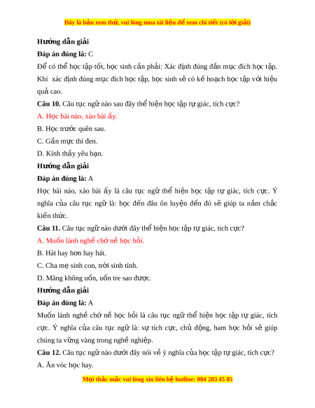 Đây là bản xem th , vu ử i lòng mua tài li u ệ đ xe ể m chi ti t (c ế ó l i ờ gi i ả ) Hư ng d ớ ẫn gi i ả Đáp án đúng là: C Để có thể h c ọ t p ậ t t ố , h c ọ sinh c n ầ ph i ả : Xác đ nh ị đúng đ n ắ m c ụ đích h c ọ t p. ậ Khi xác đ nh ị đúng m c ụ đích h c ọ t p, ậ h c ọ sinh s ẽ có k ế ho ch ạ h c ọ t p ậ v i ớ hi u ệ quả cao. Câu 10. Câu t c ng ụ nào s ữ au đây th hi ể n h ệ c ọ t p t ậ gi ự ác, tích c c? ự A. H c ọ bài nào, xào bài y ấ . B. H c t ọ rư c quên s ớ au. C. Gần m c t ự hì đen. D. Kính th y yêu b ầ n. ạ Hư ng d ớ ẫn gi i ả Đáp án đúng là: A H c ọ bài nào, xào bài y ấ là câu t c ụ ngữ thể hi n ệ h c ọ t p ậ tự giác, tích c c. ự Ý nghĩa c a ủ câu t c ụ ngữ là: h c ọ đ n ế đâu ôn luy n ệ đ n ế đó sẽ giúp ta n m ắ ch c ắ ki n t ế h c. ứ Câu 11. Câu t c ng ụ nào d ữ ư i ớ đây th hi ể n h ệ c t ọ p ậ t gi ự ác, tich c c? ự A. Muốn lành ngh ch ề n ớ h ề c ọ h i ỏ . B. Hát hay h n hay hát ơ . C. Cha m s ẹ inh con, tr i ờ sinh tính.