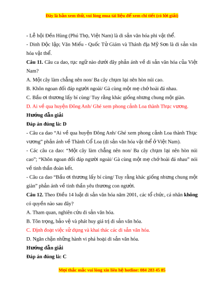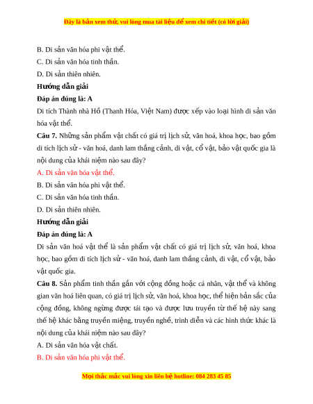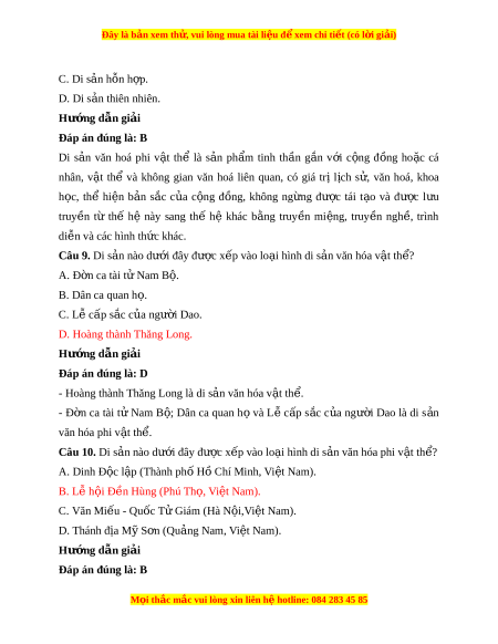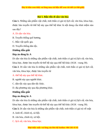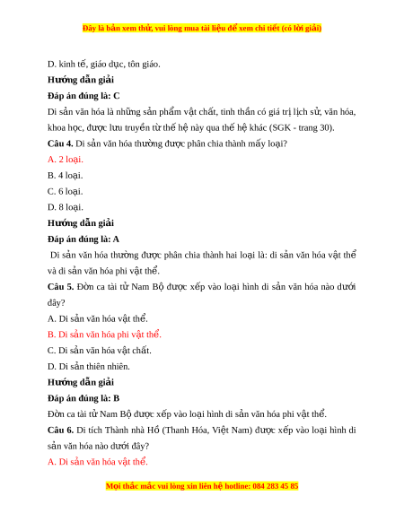 Đây là bản xem th , vu ử i lòng mua tài li u ệ đ xe ể m chi ti t (c ế ó l i ờ gi i ả ) D. kinh t , gi ế áo d c, ụ tôn giáo. Hư ng d ớ ẫn gi i ả Đáp án đúng là: C Di s n ả văn hóa là nh ng ữ s n ả ph m ẩ v t ậ ch t ấ , tinh th n ầ có giá tr ịl ch ị s , ử văn hóa, khoa h c, ọ đư c l ợ u ư truy n t ề t ừ h h ế này qua ệ thế h khác ệ (SGK - trang 30).