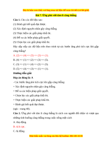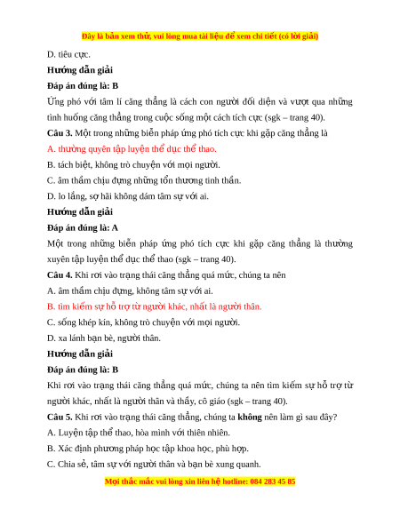 Đây là bản xem th , vu ử i lòng mua tài li u ệ đ xe ể m chi ti t (c ế ó l i ờ gi i ả ) D. tiêu c c. ự Hư ng d ớ ẫn gi i ả Đáp án đúng là: B Ứng phó v i ớ tâm lí căng th ng ẳ là cách con ngư i ờ đ i ố di n ệ và vư t ợ qua nh ng ữ tình huống căng th ng ẳ trong cu c ộ s ng m ố t ộ cách tích c c ự (sgk – trang 40). Câu 3. M t ộ trong nh ng ữ bi n pháp ễ ng phó t ứ ích c c ự khi g p ặ căng th ng ẳ là A. thư ng ờ quyên t p l ậ uy n t ệ h d ể c t ụ hể thao. B. tách bi t ệ , không trò chuy n v ệ i ớ m i ọ ngư i ờ . C. âm th m ầ ch u đ ị ng nh ự ng ữ t n t ổ hư ng ơ tinh th n. ầ D. lo l ng, ắ s hãi ợ không dám tâm s v ự i ớ ai. Hư ng d ớ ẫn gi i ả Đáp án đúng là: A M t ộ trong nh ng ữ bi n ễ pháp ng ứ phó tích c c ự khi g p ặ căng th ng ẳ là thư ng ờ xuyên t p ậ luy n t ệ h d ể c t ụ h t ể hao (sgk – trang 40). Câu 4. Khi r i ơ vào tr ng t ạ hái căng th ng ẳ quá m c, chúng ứ ta nên A. âm th m ầ ch u đ ị ng, không t ự âm sự v i ớ ai. B. tìm ki m ế s h ự t ỗ rợ t ng ừ ư i ờ khác, nh t ấ là ngư i ờ thân.