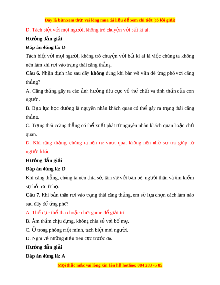 Đây là bản xem th , vu ử i lòng mua tài li u ệ đ xe ể m chi ti t (c ế ó l i ờ gi i ả ) D. Tách bi t ệ v i ớ m i ọ ngư i ờ , không trò chuy n v ệ i ớ b t ấ kì ai. Hư ng d ớ ẫn gi i ả Đáp án đúng là: D Tách bi t ệ v i ớ m i ọ ngư i ờ , không trò chuy n ệ v i ớ b t ấ kì ai là vi c ệ chúng ta không nên làm khi r i ơ vào tr ng t ạ hái căng th ng. ẳ Câu 6. Nh n ậ đ nh