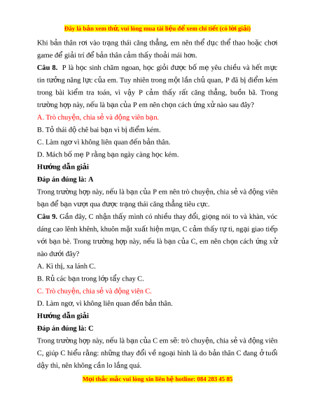 Đây là bản xem th , vu ử i lòng mua tài li u ệ đ xe ể m chi ti t (c ế ó l i ờ gi i ả ) Khi b n ả thân r i ơ vào tr ng ạ thái căng th ng, ẳ em nên thể d c ụ thể thao ho c ặ ch i ơ game đ gi ể i ả trí để b n t ả hân c m ả th y t ấ ho i ả mái h n. ơ Câu 8. P là h c ọ sinh chăm ngoan, h c ọ gi i ỏ đư c ợ bố mẹ yêu chi u ề và h t ế m c ự tin tư ng ở năng l c ự c a ủ em. Tuy nhiên trong m t ộ l n ầ ch ủ quan, P đã bị đi m ể kém trong bài ki m ể tra toán, vì v y ậ P c m ả th y ấ r t ấ căng th ng, ẳ bu n ồ bã. Trong trư ng h ờ p này ợ , n u l ế à b n c ạ a ủ P em nên ch n cách ọ ng x ứ nào s ử au đây?