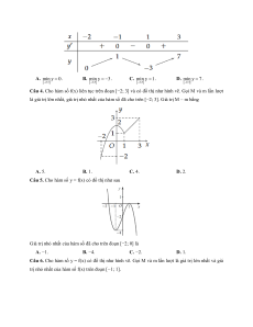 Câu 3. Cho hàm số có bảng biến thiên như hình vẽ. Tìm giá trị nhỏ nhất của hàm số trên đoạn [−2; 3]. A. min y 0 . B. min y 3 . C. min y 1. D. min y 7 . 2 ;3 2 ;3 2 ; 3 2 ;3