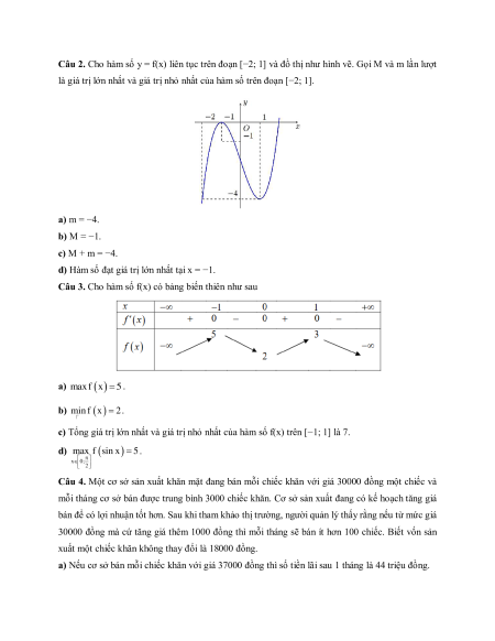 là giá trị lớn nhất và giá trị nhỏ nhất của hàm số trên đoạn [−2; 1]. a) m = −4. b) M = −1. c) M + m = −4.