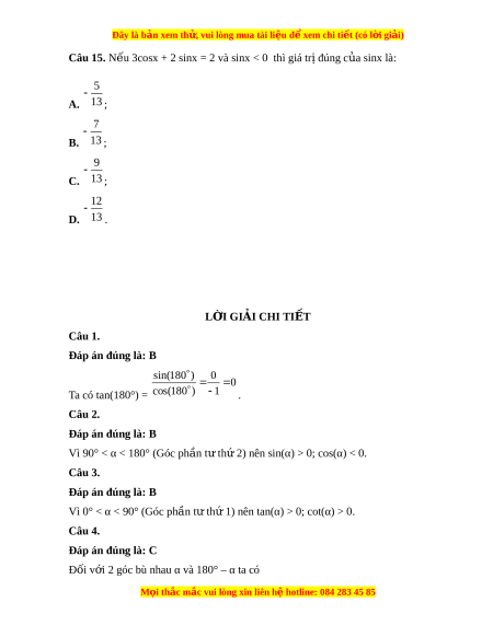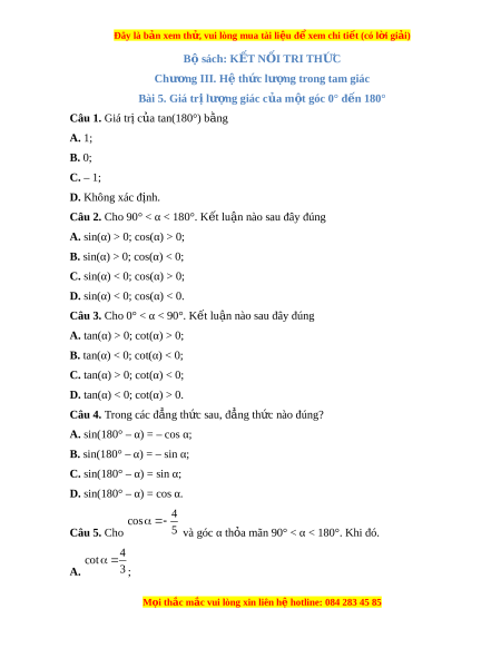 Đây là bản xem th , vu ử i lòng mua tài li u ệ đ xe ể m chi ti t (c ế ó l i ờ gi i ả ) Bộ sách: KẾT N I Ố TRI TH C Ứ Chư ng I ơ II. H t ệ h c l ứ ư ng t ợ rong tam giác Bài 5. Giá tr l ị ư ng gi ợ ác c a m ủ t ộ góc 0° đ n 180° ế Câu 1. Giá tr c ị a ủ tan(180°) b ng ằ A. 1; B. 0; C. – 1; D. Không xác định.