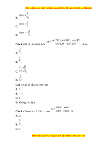 tan 30 sin 60 cos 45 M Câu 6. Giá tr c ị a ủ bi u t ể h c ứ 2 2 cot 120 cos 150 b ng: ằ 2 A. 7 ; 1 B. 7 ; 5 6 C. 6 3 ; 7 D. 13 . Câu 7. Giá tr c ị a ủ cot1485° là: A. 1; B. – 1; C. 0; D. Không xác định. 3sin cos A