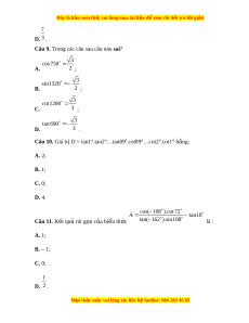 Câu 9. Trong các câu sau câu nào sai? 3 cos750 A. 2 ; 3 sin1320 B. 2 ; 3 cot1200 C. 3 ; 3 tan 690 D. 3 . Câu 10. Giá tr D
