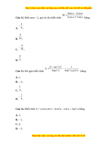 Đây là bản xem th , vu ử i lòng mua tài li u ệ đ xe ể m chi ti t (c ế ó l i ờ gi i ả ) 3sin 2cos M Câu 12. Bi t ế tanα = 2, giá tr c ị a ủ bi u ể th c ứ 5cos 7sin b ng: ằ 4 A. 9 ; 4 B. 19 ; 4 C. 19 ; 4 D. 9 . 2 2 (1 tan ) 1 A Câu 13. Rút g n bi ọ u ể th c ứ 2 2 2 4tan 4sin . cos b ng: ằ A. 1; B. – 1; 1 C. 4 ; 1 D. 4 . Câu 14. Bi u t ể h c
