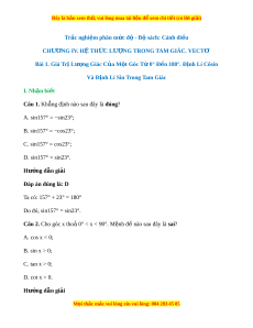 Bài 1. Giá Trị Lư ng G ợ iác C a M ủ t ộ Góc T 0° Đ ừ n 180°. Đ ế nh L ị í Côsin Và Đ nh L ị í Sin Trong Tam Giác I. Nhận bi t ế Câu 1. Kh ng ẳ đ nh nào s ị au đây là đúng? A. sin157° = −sin23°; B. sin157° = −cos23°; C. sin157° = cos23°; D. sin157° = sin23°. Hư ng d ớ ẫn gi i ả Đáp án đúng là: D Ta có: 157° + 23° = 180° Do đó, sin157° = sin23°.