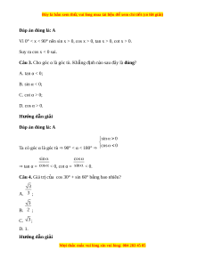 tan α = cos < 0, cot α = sin < 0. Câu 4. Giá tr c ị a cos ủ 30° + sin 60° b ng ằ bao nhiêu? 3 A. 3 ; 3 B. 2 ; C. 3 ; D. 1. Hư ng d ớ ẫn gi i ả M i ọ thắc m c