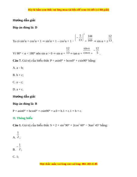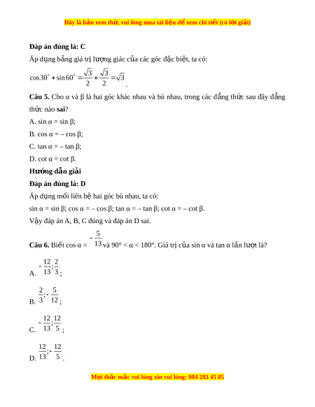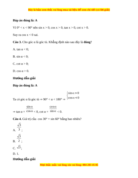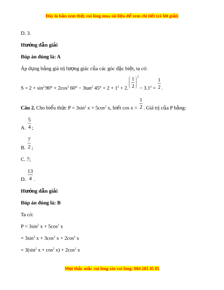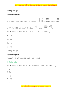 Đây là bản xem th , vu ử i lòng mua tài li u ệ đ xe ể m chi ti t (c ế ó l i ờ gi i ả ) Đáp án đúng là: C Áp d ng ụ b ng gi ả á tr l ị ư ng ợ giác c a các ủ góc đ c ặ bi t ệ , ta có: 3 3 cos30 sin 60 3 2 2 .