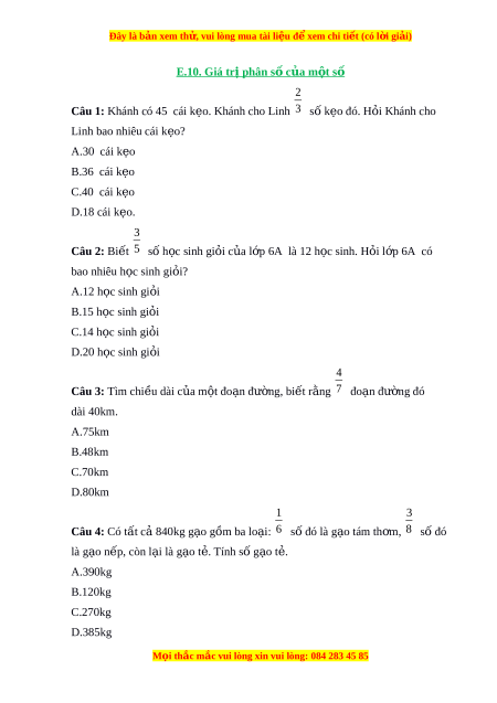 Câu 1: Khánh có 45 cái kẹo. Khánh cho Linh 3 số kẹo đó. H i ỏ Khánh cho Linh bao nhiêu cái k o? ẹ A.30 cái kẹo B.36 cái kẹo C.40 cái kẹo D.18 cái kẹo. 3 Câu 2: Bi t ế 5 số h c s ọ inh gi i ỏ c a l ủ p ớ 6A là 12 h c s ọ inh. H i ỏ l p ớ 6A có bao nhiêu h c s ọ inh gi i ỏ ? A.12 h c s ọ inh gi i ỏ B.15 h c ọ sinh gi i ỏ C.14 h c ọ sinh gi i ỏ D.20 h c s ọ inh gi i ỏ 4 Câu 3: Tìm chi u dài ề c a m ủ t ộ đo n đ ạ ư ng, bi ờ t ế r ng ằ 7 đo n ạ đư ng đó ờ dài 40km. A.75km B.48km C.70km D.80km 1 3