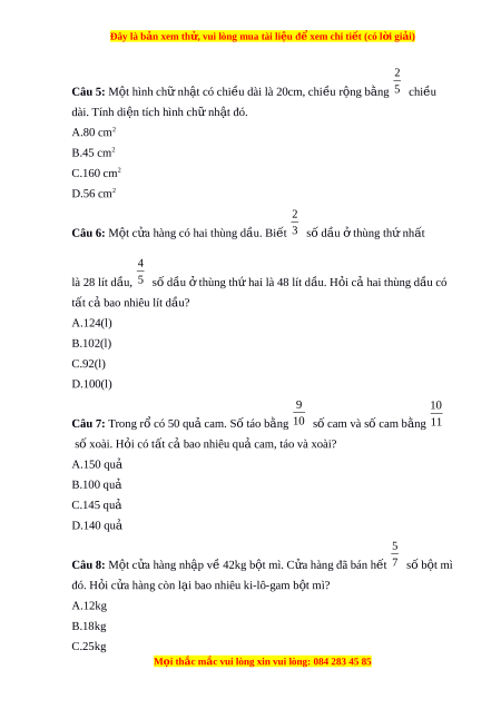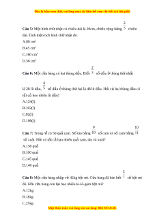 Đây là bản xem th , vu ử i lòng mua tài li u ệ đ xe ể m chi ti t ế (có l i ờ gi i ả ) 2 Câu 5: M t ộ hình ch nh ữ t ậ có chi u dài ề là 20cm, chi u ề r ng b ộ ng ằ 5 chi u ề dài. Tính di n t ệ ích hình chữ nh t ậ đó. A.80 cm2 B.45 cm2 C.160 cm2 D.56 cm2 2 Câu 6: M t ộ c a hàng ử có hai thùng d u. B ầ i t ế 3 số dầu t ở hùng th nh ứ ất 4 là 28 lít d u, ầ 5 số dầu t ở hùng th hai ứ là 48 lít d u. H ầ i ỏ cả hai thùng d u có ầ tất c bao nhi ả êu lít d u? ầ A.124(l) B.102(l) C.92(l) D.100(l) 9 10