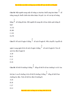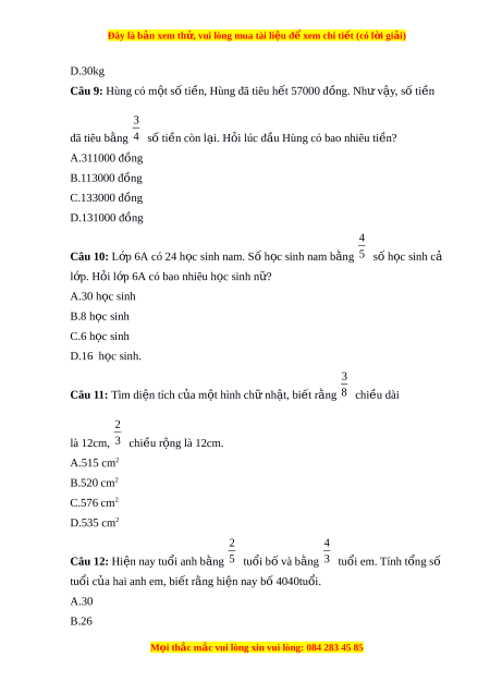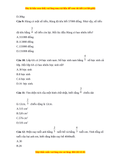 Đây là bản xem th , vu ử i lòng mua tài li u ệ đ xe ể m chi ti t ế (có l i ờ gi i ả ) D.30kg Câu 9: Hùng có m t ộ số ti n, H ề ùng đã tiêu h t ế 57000 đồng. Nh v ư y ậ , số ti n ề 3 đã tiêu b ng ằ 4 số ti n còn l ề i ạ . H i ỏ lúc đ u H ầ ùng có bao nhiêu ti n? ề A.311000 đồng B.113000 đồng C.133000 đồng D.131000 đồng 4 Câu 10: L p ớ 6A có 24 h c ọ sinh nam. S h ố c s ọ inh nam b ng ằ 5 số h c s ọ inh cả l p. H ớ i ỏ l p ớ 6A có bao nhiêu h c s ọ inh n ? ữ A.30 h c s ọ inh B.8 h c ọ sinh C.6 h c ọ sinh D.16 h c s ọ inh. 3 Câu 11: Tìm di n t ệ ích c a m ủ t ộ hình chữ nh t ậ , bi t ế r ng ằ 8 chi u ề dài 2 là 12cm, 3 chi u ề r ng l ộ à 12cm. A.515 cm2 B.520 cm2 C.576 cm2 D.535 cm2 2 4 Câu 12: Hi n nay t ệ uổi anh b ng ằ 5 tuổi bố và b ng ằ 3 tuổi em. Tính t ng s ổ ố tuổi c a ủ hai anh em, bi t ế r ng hi ằ n nay b ệ ố 4040tuổi. A.30 B.26 M i