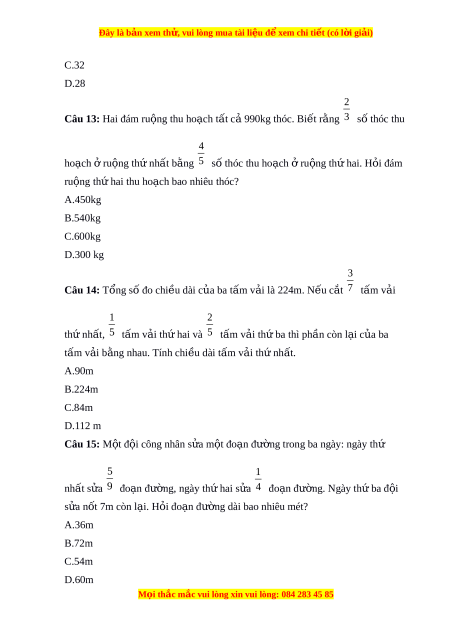 Câu 13: Hai đám ru ng t ộ hu ho ch ạ t t ấ cả 990kg thóc. Bi t ế r ng ằ 3 số thóc thu 4 ho ch ạ ở ru ng ộ thứ nh t ấ b ng ằ 5 số thóc thu hoạch r ở u ng t ộ h hai ứ . H i ỏ đám ru ng ộ th hai ứ thu ho ch bao ạ nhiêu thóc? A.450kg B.540kg C.600kg D.300 kg 3 Câu 14: T ng s ổ ố đo chi u dài ề c a ba ủ t m ấ v i ả là 224m. N u c ế t ắ 7 tấm v i ả 1 2 th nh ứ ất, 5 tấm v i ả th hai ứ và 5 tấm v i ả th ba t ứ hì ph n còn l ầ i ạ c a ủ ba tấm v i ả b ng nhau. ằ Tính chi u ề dài t m ấ v i ả th nh ứ t ấ . A.90m B.224m C.84m D.112 m Câu 15: M t ộ đ i ộ công nhân s a m ử t ộ đo n ạ đư ng t ờ rong ba ngày: ngày th ứ 5 1 nh t ấ s a ử 9 đo n ạ đư ng, ngày t ờ h hai ứ s a ử 4 đo n đ ạ ư ng. ờ Ngày th ba đ ứ i ộ s a ử nốt 7m còn l i ạ . H i ỏ đo n ạ đư ng dài ờ bao nhiêu mét? A.36m B.72m C.54m D.60m M i