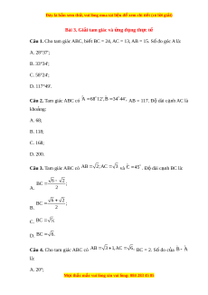 Câu 6. Cho tam giác ABC có AB = 5, A 40 , B 60 . Độ dài BC g n ầ nh t ấ v i ớ k t ế qu nào? ả A. 3,1; B. 3,3; C. 3,5; D. 3,7.