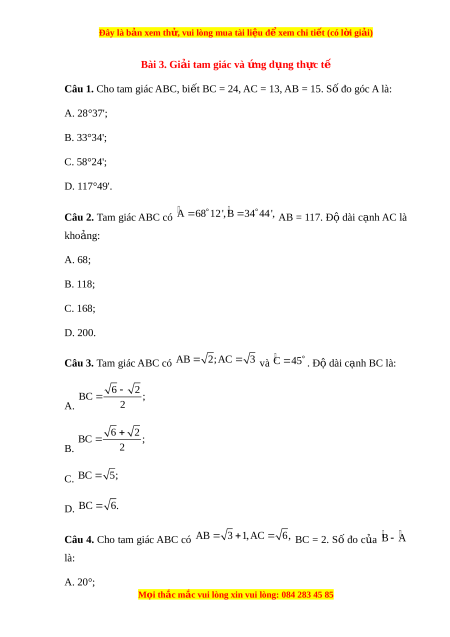 Câu 2. Tam giác ABC có A 68 12 ', B 34 44 ', AB = 117. Đ ộ dài c nh ạ AC là kho ng: ả A. 68; B. 118; C. 168; D. 200.