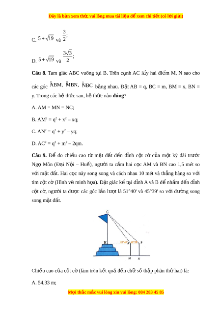 ặ AB = q, BC = m, BM = x, BN = y. Trong các hệ th c s ứ au, hệ th c ứ nào đúng? A. AM = MN = NC; B. AM2 = q2 + x2 – xq; C. AN2 = q2 + y2 – yq; D. AC2 = q2 + m2 – 2qm. Câu 9. Để đo chi u ề cao từ m t ặ đ t ấ đ n ế đ nh ỉ c t ộ cờ c a ủ m t ộ kỳ đài trư c ớ Ngọ Môn (Đ i ạ N i ộ – Hu ) ế , ngư i ờ ta c m ắ hai c c ọ AM và BN cao 1,5 mét so v i ớ m t ặ đ t ấ . Hai c c