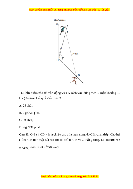 Câu 11. Vào lúc 9 gi s ờ áng, hai v n đ ậ ng vi ộ ên A và B xu t ấ phát t cùng ừ m t ộ vị trí O. V n ậ đ ng ộ viên A ch y ạ v i ớ v n ậ t c ố 13 km/h theo m t ộ góc so v i ớ hư ng ớ B c ắ là 15°, v n ậ đ ng ộ viên B ch y ạ v i ớ v n ậ t c ố 12 km/h theo m t ộ góc so v i ớ hư ng ớ B c ắ là 135° (hình v ) ẽ . M i ọ thắc m c
