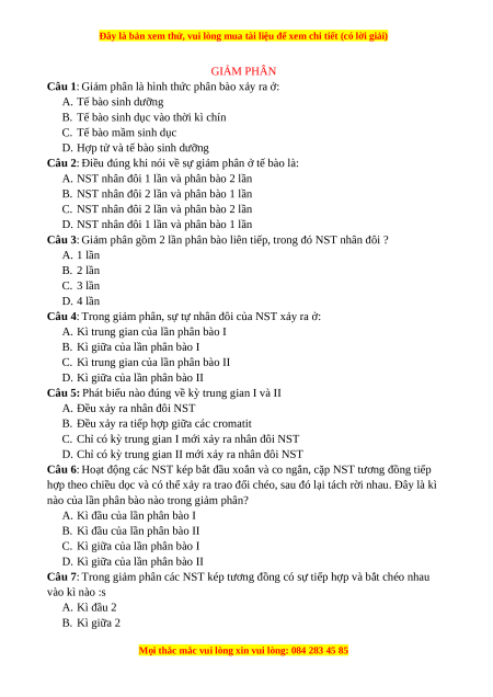 Câu 1: Giảm phân là hình thức phân bào xảy ra ở: A. Tế bào sinh dưỡng