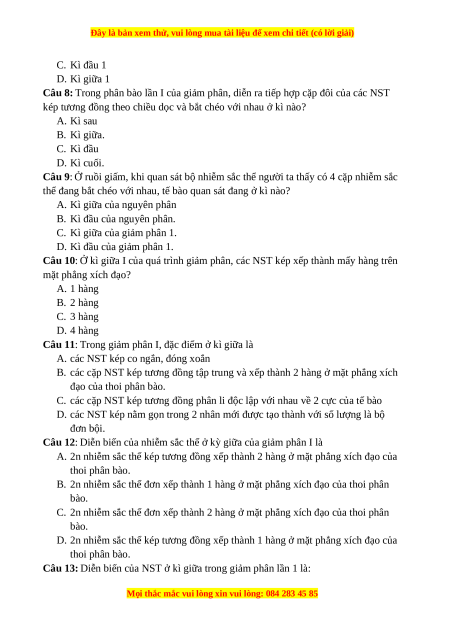 Câu 10: Ở kì giữa I của quá trình giảm phân, các NST kép xếp thành mấy hàng trên mặt phẳng xích đạo? A. 1 hàng B. 2 hàng C. 3 hàng D. 4 hàng