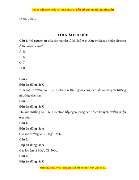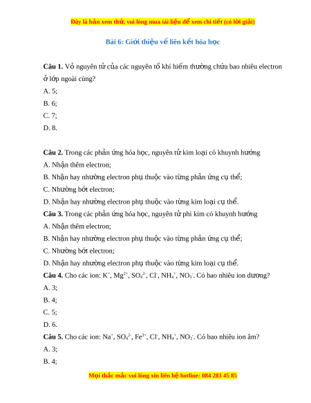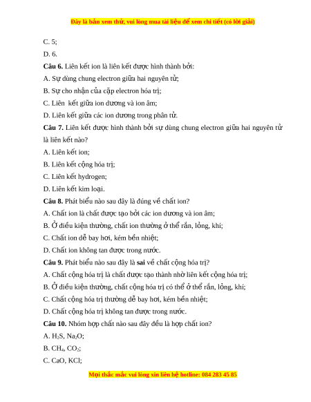 Đây là bản xem th , vu ử i lòng mua tài li u ệ đ xe ể m chi ti t (c ế ó l i ờ gi i ả ) C. 5; D. 6. Câu 6. Liên k t ế ion là liên k t ế đư c hì ợ nh thành b i ở : A. S dùng chung el ự ectron gi a hai ữ nguyên t ; ử B. S cho nh ự n ậ c a c ủ p el ặ ectron hóa tr ; ị C. Liên k t ế gi a i ữ on dư ng và ơ ion âm; D. Liên k t ế gi a ữ các ion dư ng ơ trong phân t . ử Câu 7. Liên k t ế đư c ợ hình thành b i