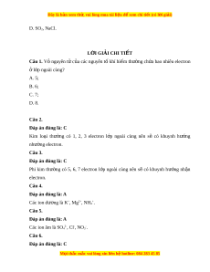 ớ ngoài cùng nên sẽ có khuynh hư ng ớ như ng el ờ ectron. Câu 3. Đáp án đúng là: C Phi kim thư ng ờ có 5, 6, 7 electron l p ớ ngoài cùng nên s ẽ có khuynh hư ng ớ nh n ậ electron. Câu 4. Đáp án đúng là: A Các ion dư ng ơ là K+, Mg2+, NH + 4 . Câu 5. Đáp án đúng là: A Các ion âm là SO 2- - 4 , Cl-, NO3 . Câu 6. Đáp án đúng là: C M i