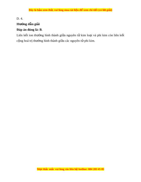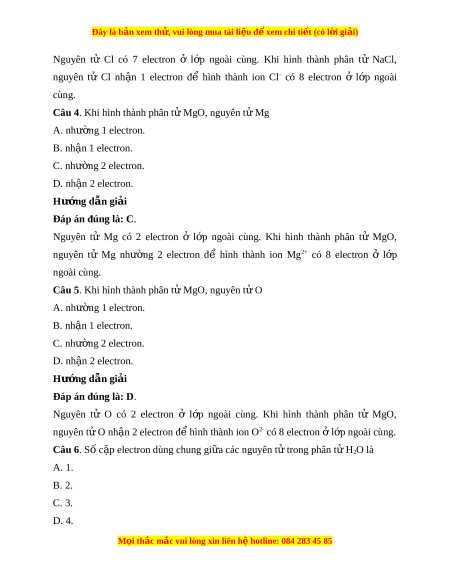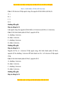 Đây là bản xem th , vu ử i lòng mua tài li u ệ đ xe ể m chi ti t (c ế ó l i ờ gi i ả ) Bài 6. Gi i ớ thi u v ệ l ề iên k t ế hoá h c ọ Câu 1. Số electron l ở p ngoài ớ cùng c a ủ nguyên t khí ử hi m ế (tr H ừ e) là A. 1. B. 3. C. 5. D. 8. Hư ng d ớ ẫn gi i ả