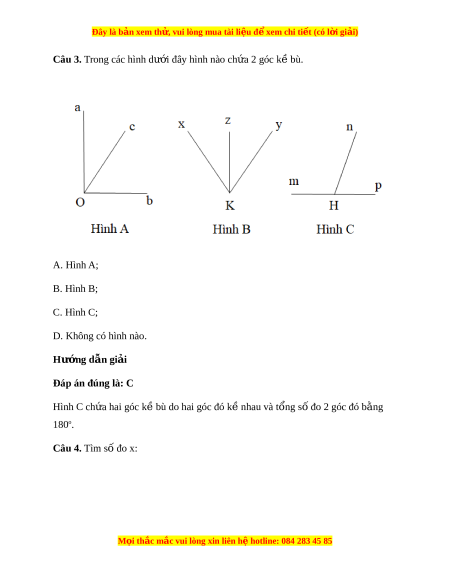 ớ đây hình nào ch a 2 góc ứ k bù. ề A. Hình A; B. Hình B; C. Hình C; D. Không có hình nào. Hư ng d ớ ẫn gi i ả Đáp án đúng là: C Hình C ch a hai ứ