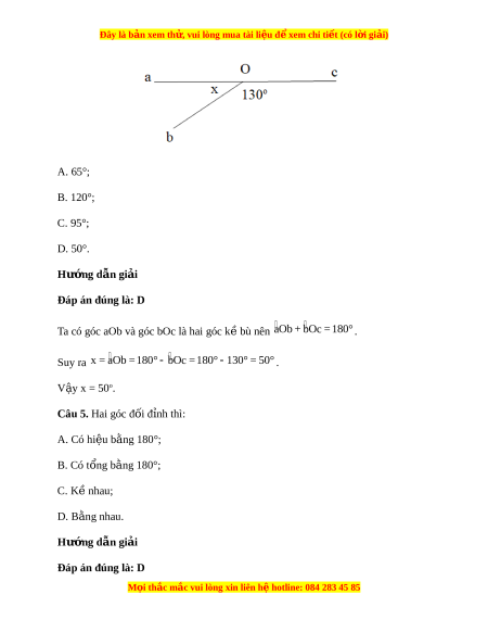 Đây là bản xem th , vu ử i lòng mua tài li u ệ đ xe ể m chi ti t (c ế ó l i ờ gi i ả ) A. 65°; B. 120°; C. 95°; D. 50°. Hư ng d ớ ẫn gi i ả Đáp án đúng là: D