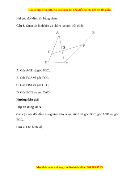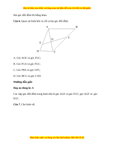 Câu 6. Quan sát hình bên và ch r ỉ a hai góc đ i ố đ nh. ỉ A. Góc AGE và góc FGC; B. Góc FGA và góc FGC; C. Góc FBA và góc GFC; D. Góc BCG và góc CAD. Hư ng d ớ ẫn gi i ả Đáp án đúng là: A Các c p ặ góc đ i ố đ nh t ỉ