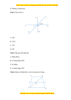 Câu 2. Hai góc bù nhau là hai góc có tổng số đo bằng: A. 120°; B. 90°; C. 60°; D. 120°.