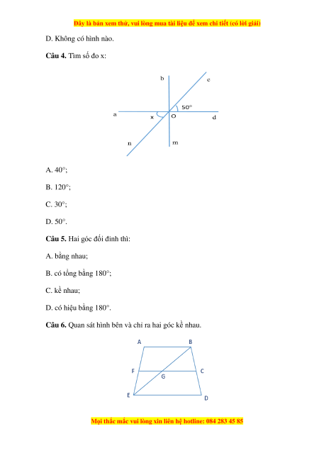 Câu 4. Tìm số đo x: A. 40°; B. 120°; C. 30°; D. 50°.