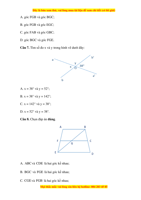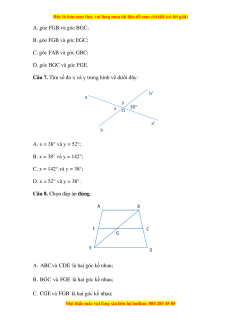 Câu 7. Tìm số đo x và y trong hình vẽ dưới đây: A. x = 38° và y = 52°; B. x = 38° và y = 142°; C. x = 142° và y = 38°; D. x = 52° và y = 38°.