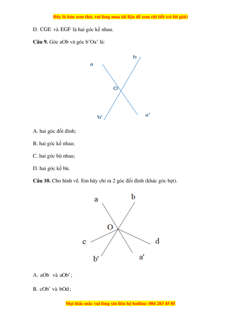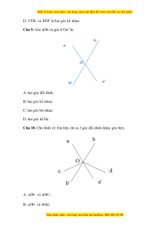 Câu 9. Góc aOb và góc b’Oa’ là: A. hai góc đối đỉnh; B. hai góc kề nhau; C. hai góc bù nhau; D. hai góc kề bù.